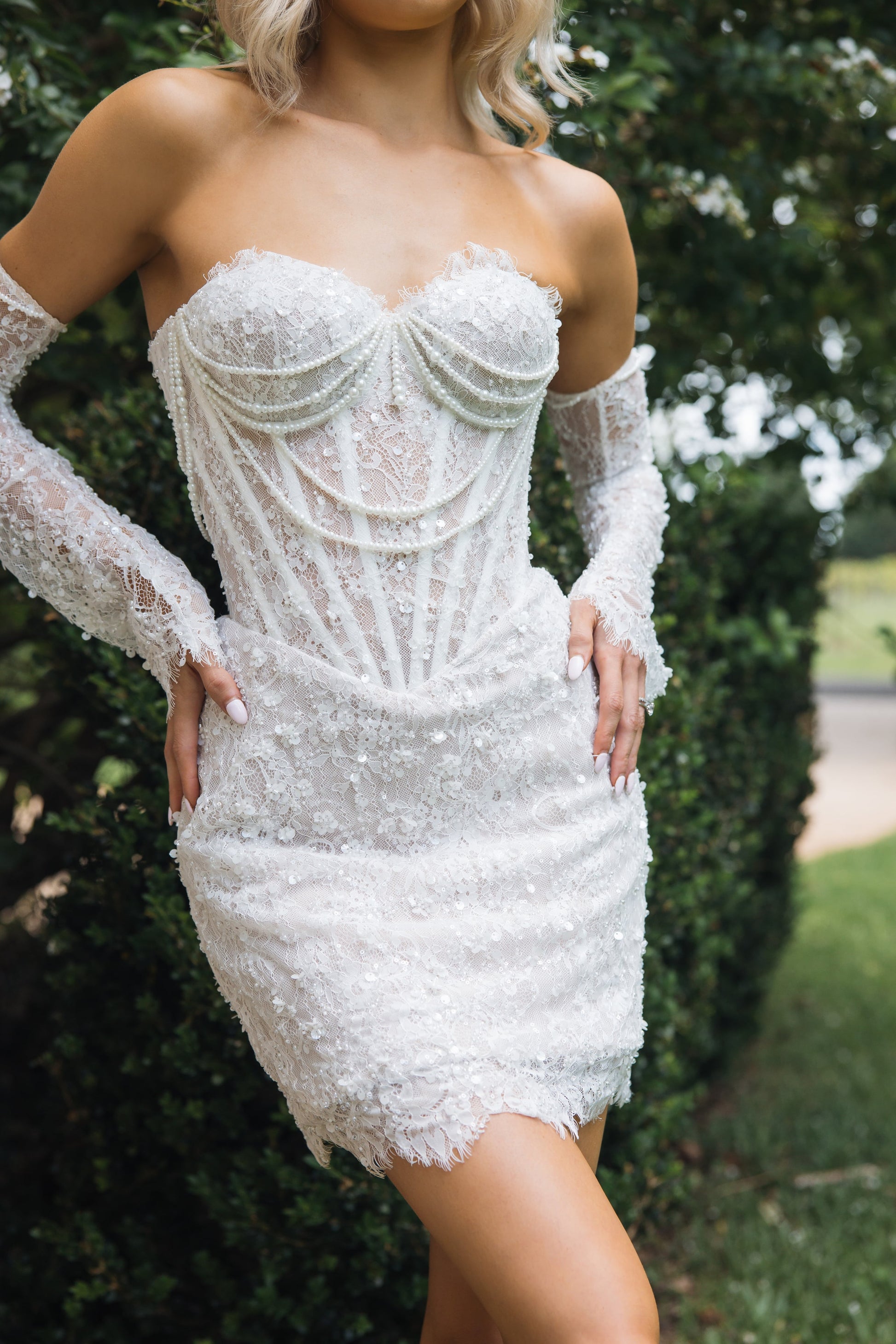 A defined corset shapes the body with clean precision, creating a strong foundation for the intricate textures layered over it. Sheer lace softens the lines without diluting them, while pearl draping adds a subtle, controlled light play that feels directional on the body. Detachable lace sleeves shift the styling possibilities, allowing the look to move from modern to softly romantic without losing its clarity. Every element is considered; every detail contributes to the silhouette. A sharp, modern mini with rich, refined texture that holds its ground.