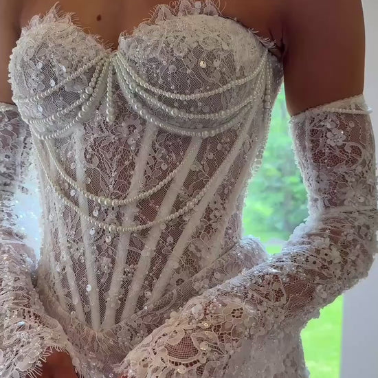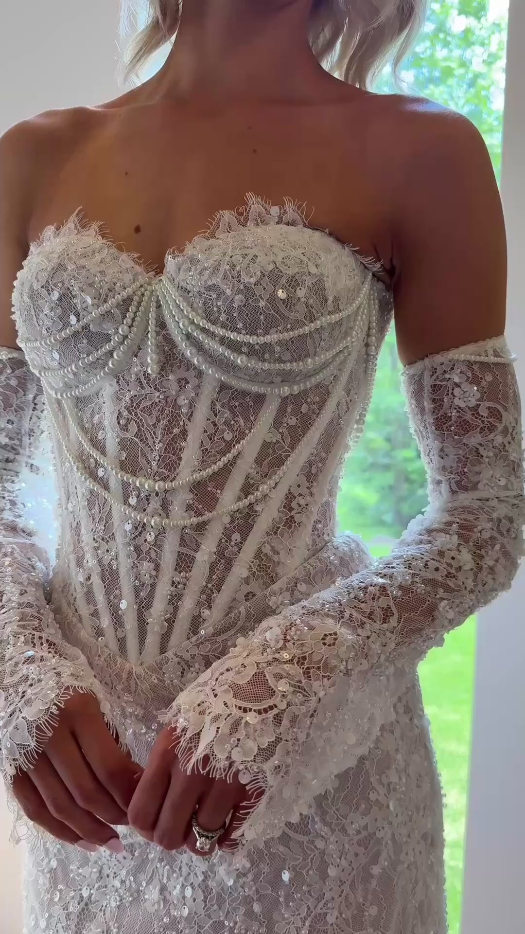 - Details: Pearl-draped bodice, detachable lace gloves, matching lace choker