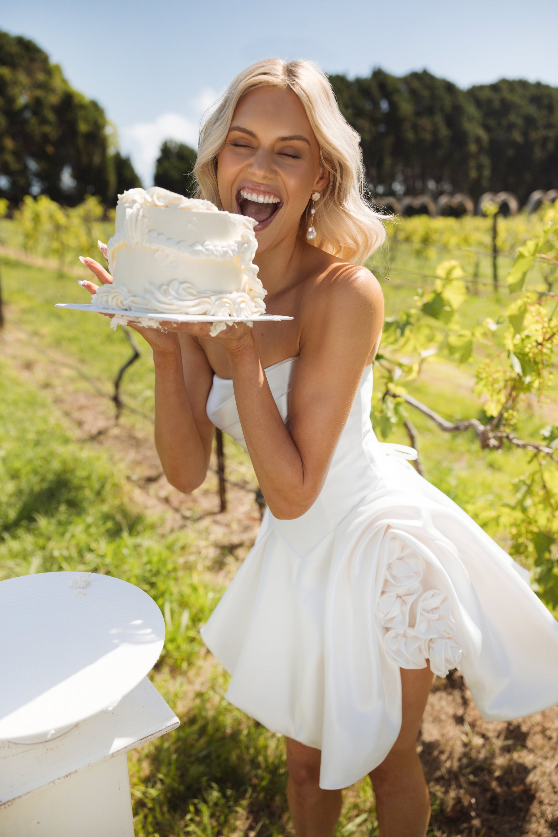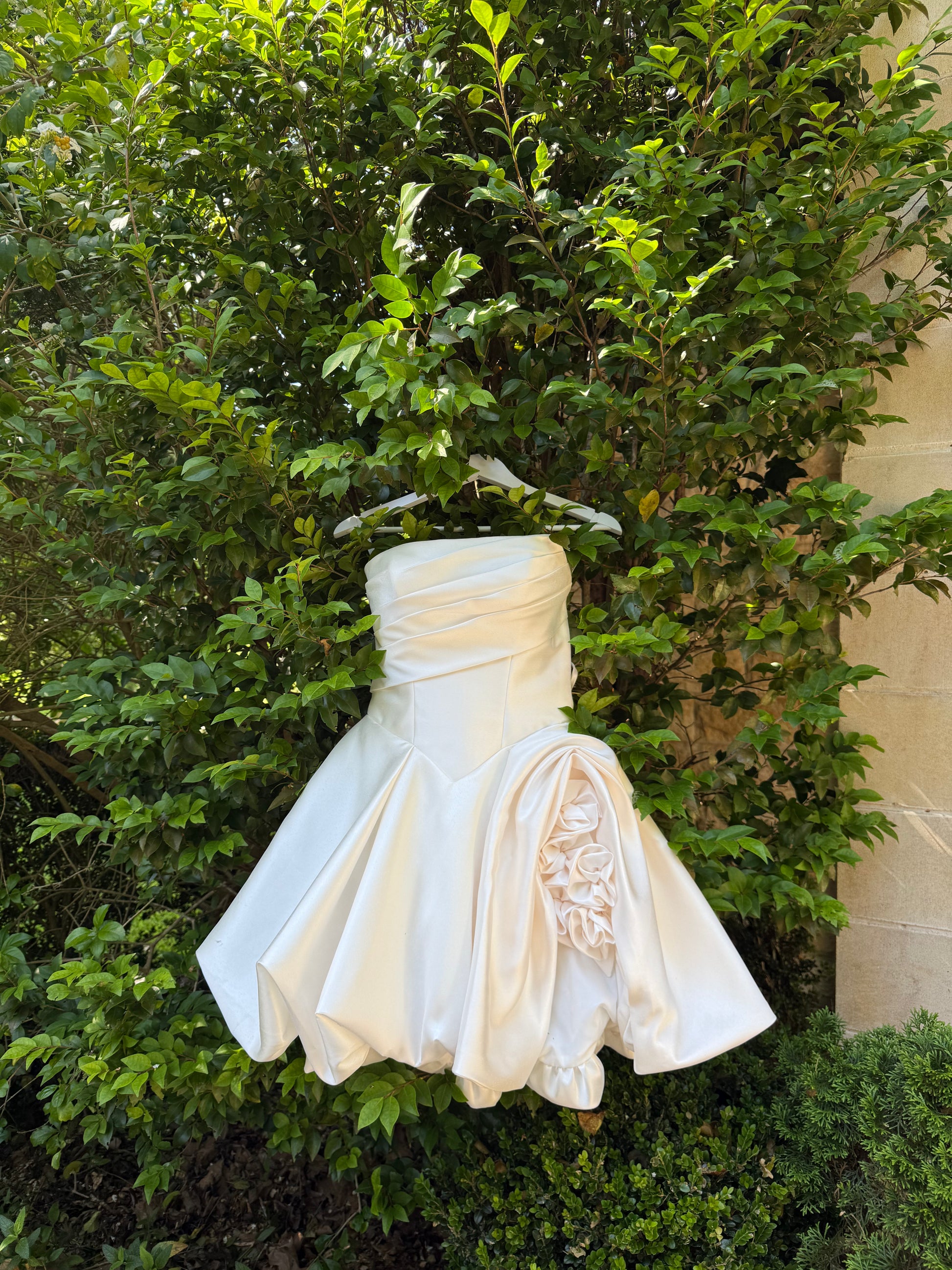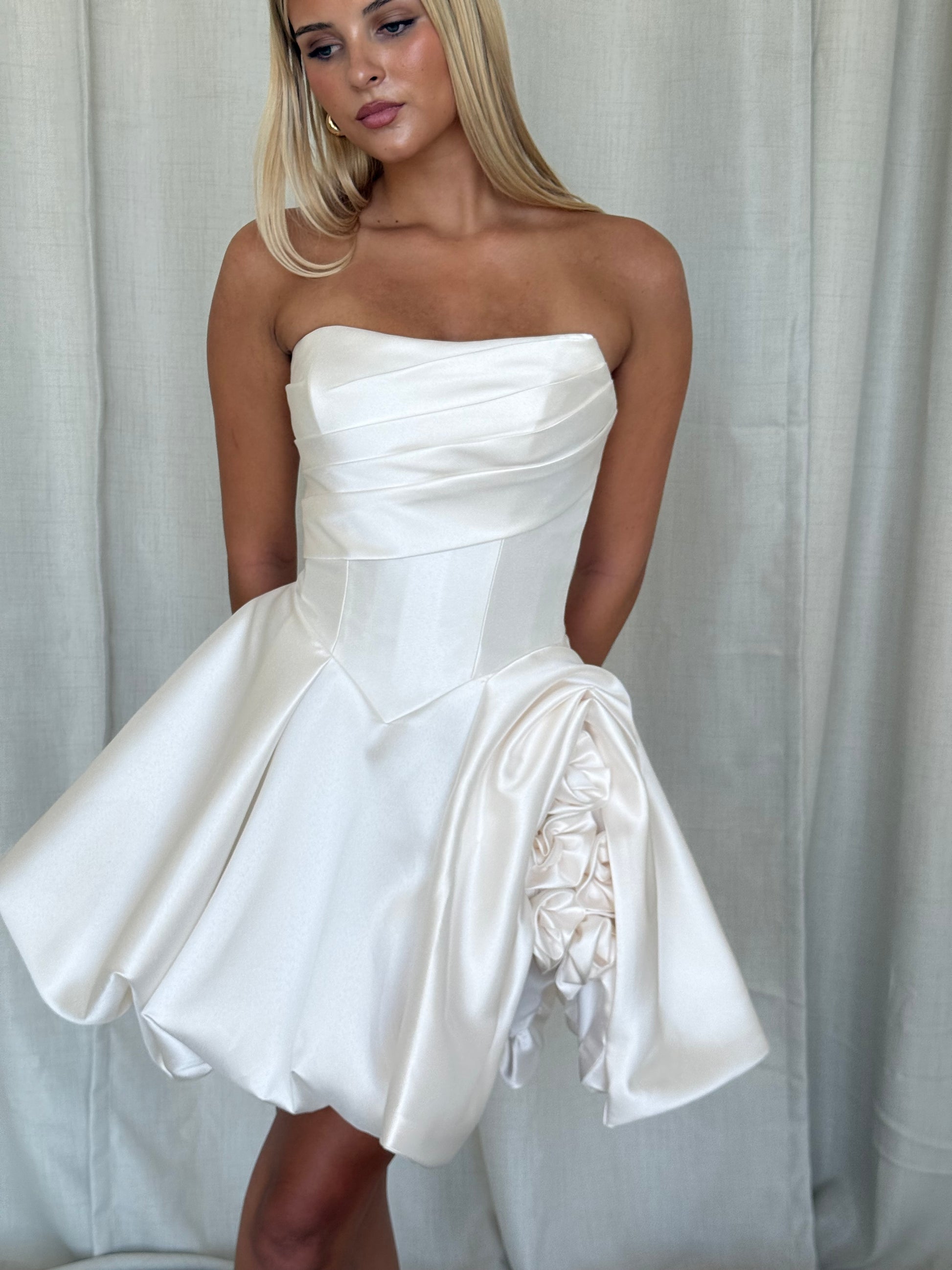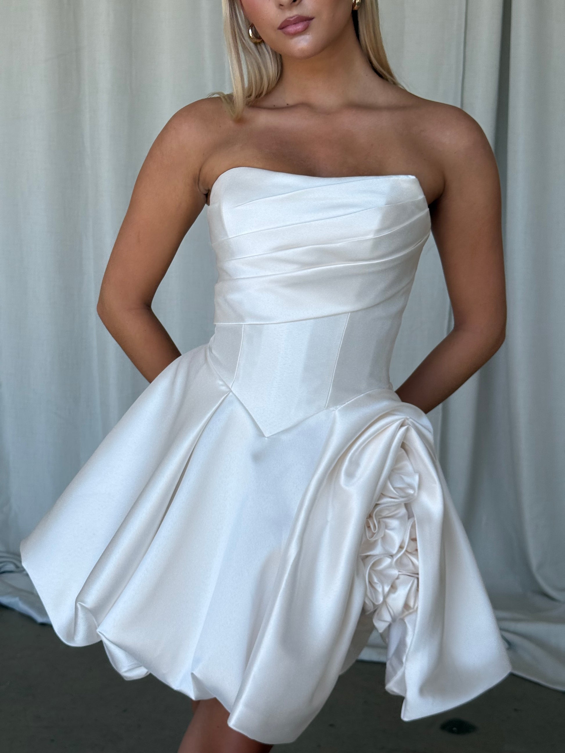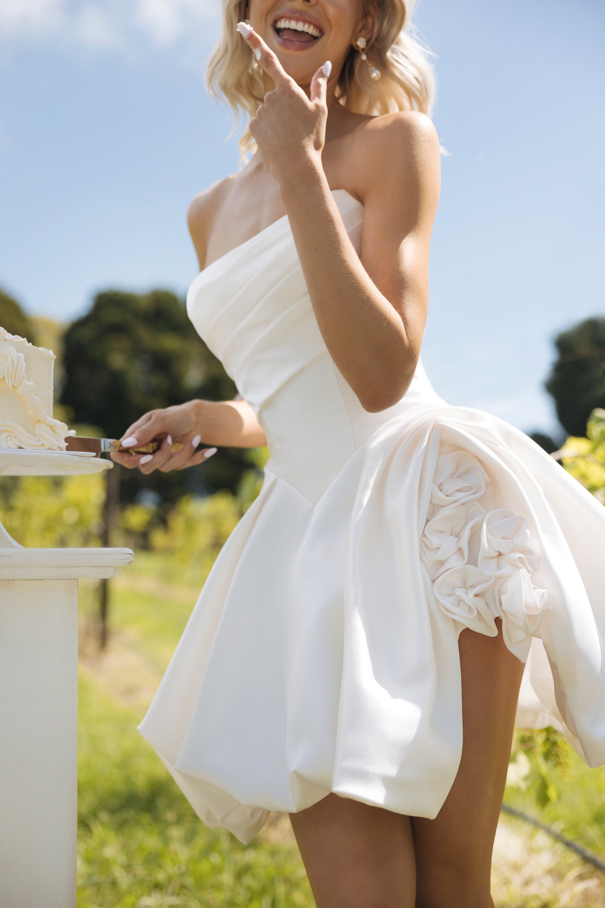 The wrapped mikado satin bodice creates a distinct upper contour with crisp, folded lines that define the torso. The full bubble skirt provides volume that holds its form with intention, reinforced by the structure of the mikado. The signature rosette adds a composed focal point without overpowering the silhouette. Mia is bold, modern, and striking; a study in form and fashion-led construction.