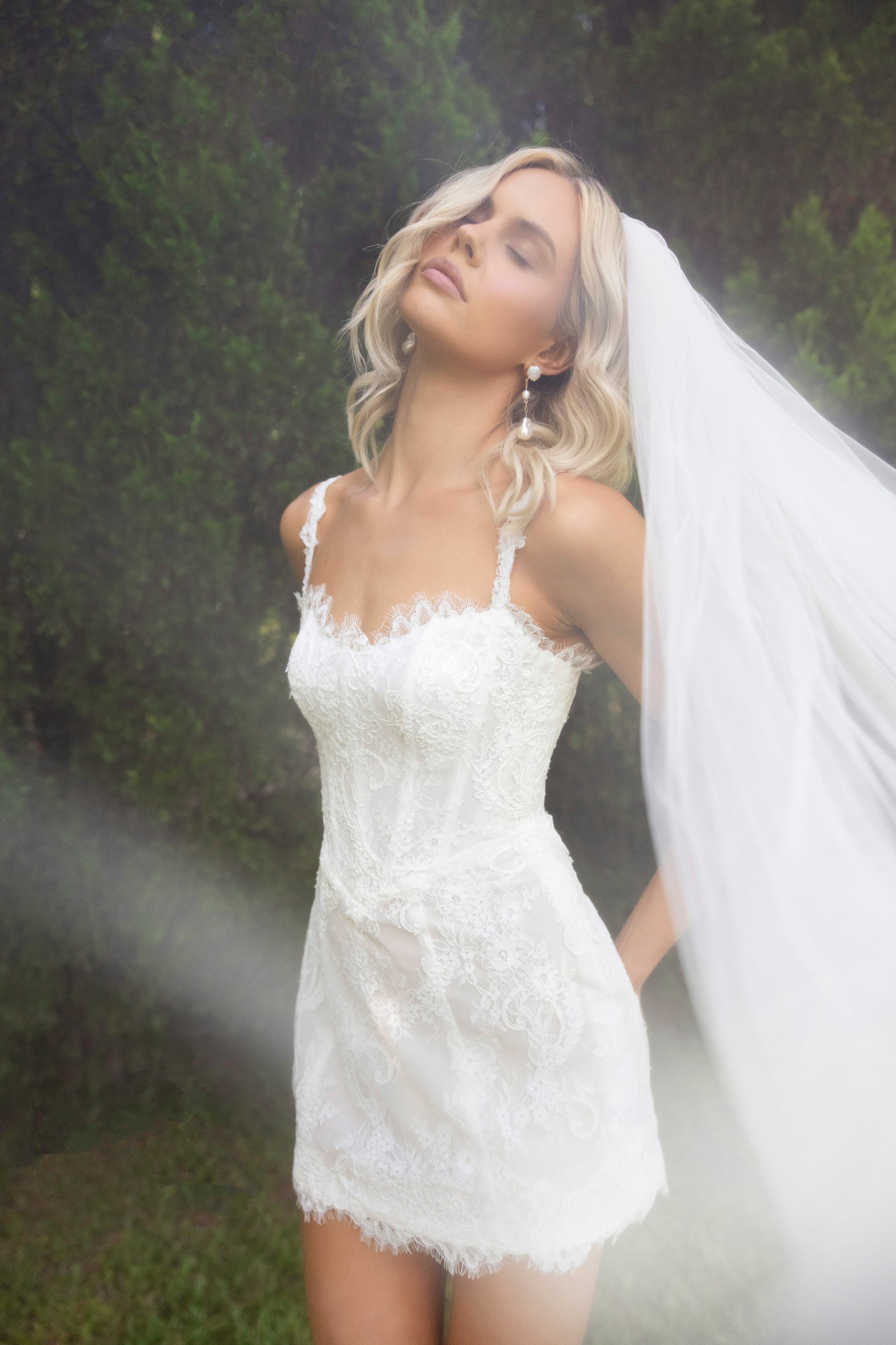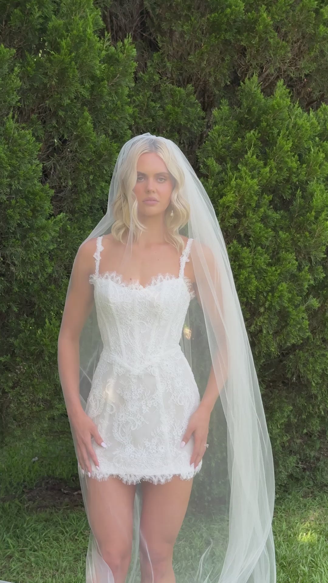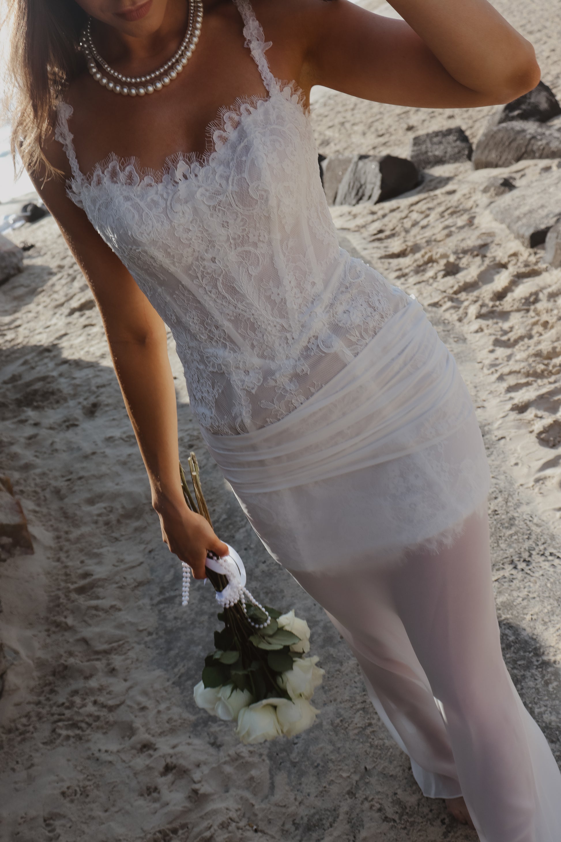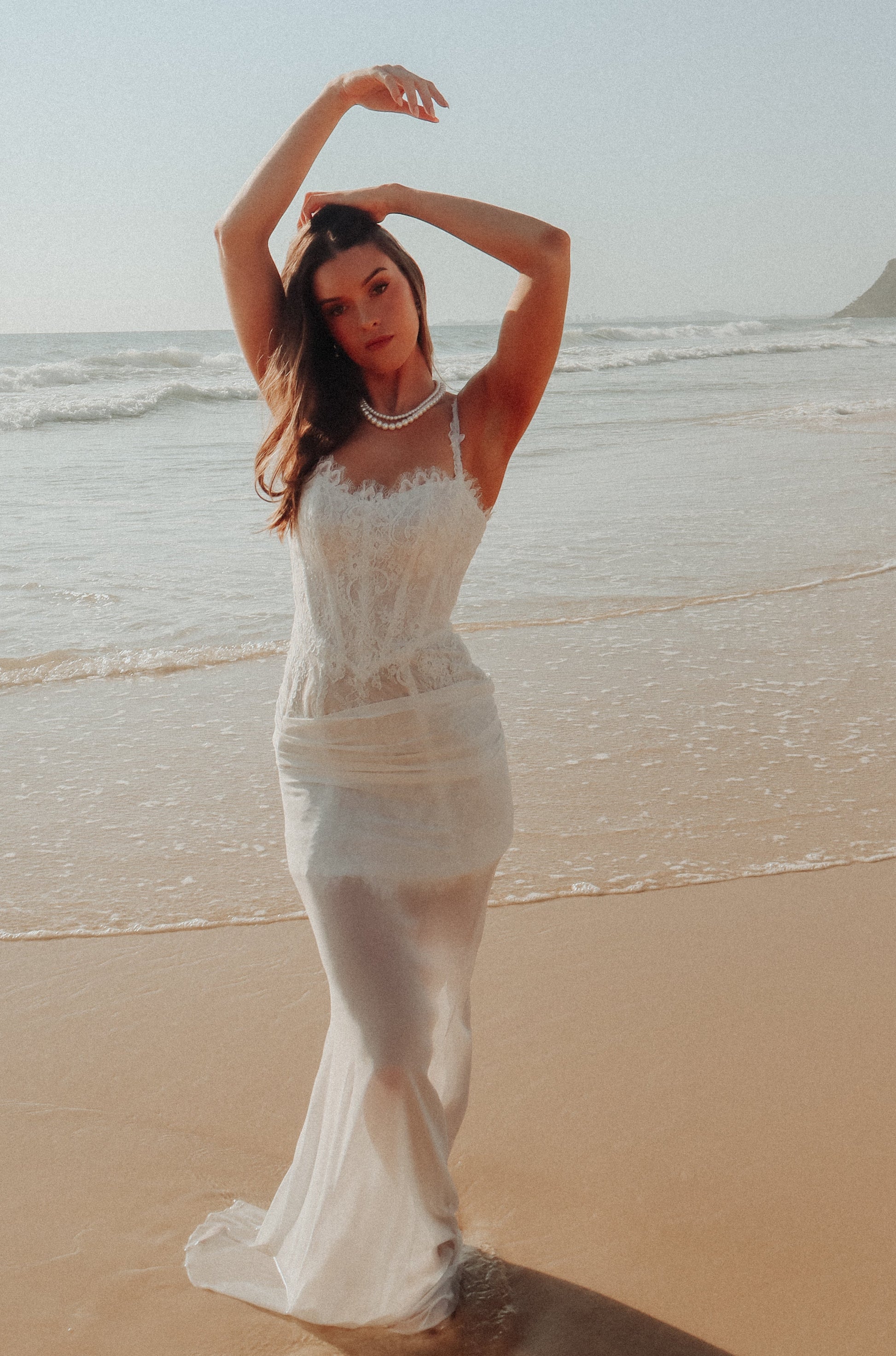 Sienna blends defined structure with a light outer layer. The lace corset mini forms the core of the silhouette, shaping the body with intention and clarity. French eyelash lace along the neckline adds subtle texture and refinement. The chiffon overskirt extends the line with airy movement, offering a softer impression while maintaining the integrity of the fitted base. The combination creates a modern look with depth, direction, and an understated romantic finish.